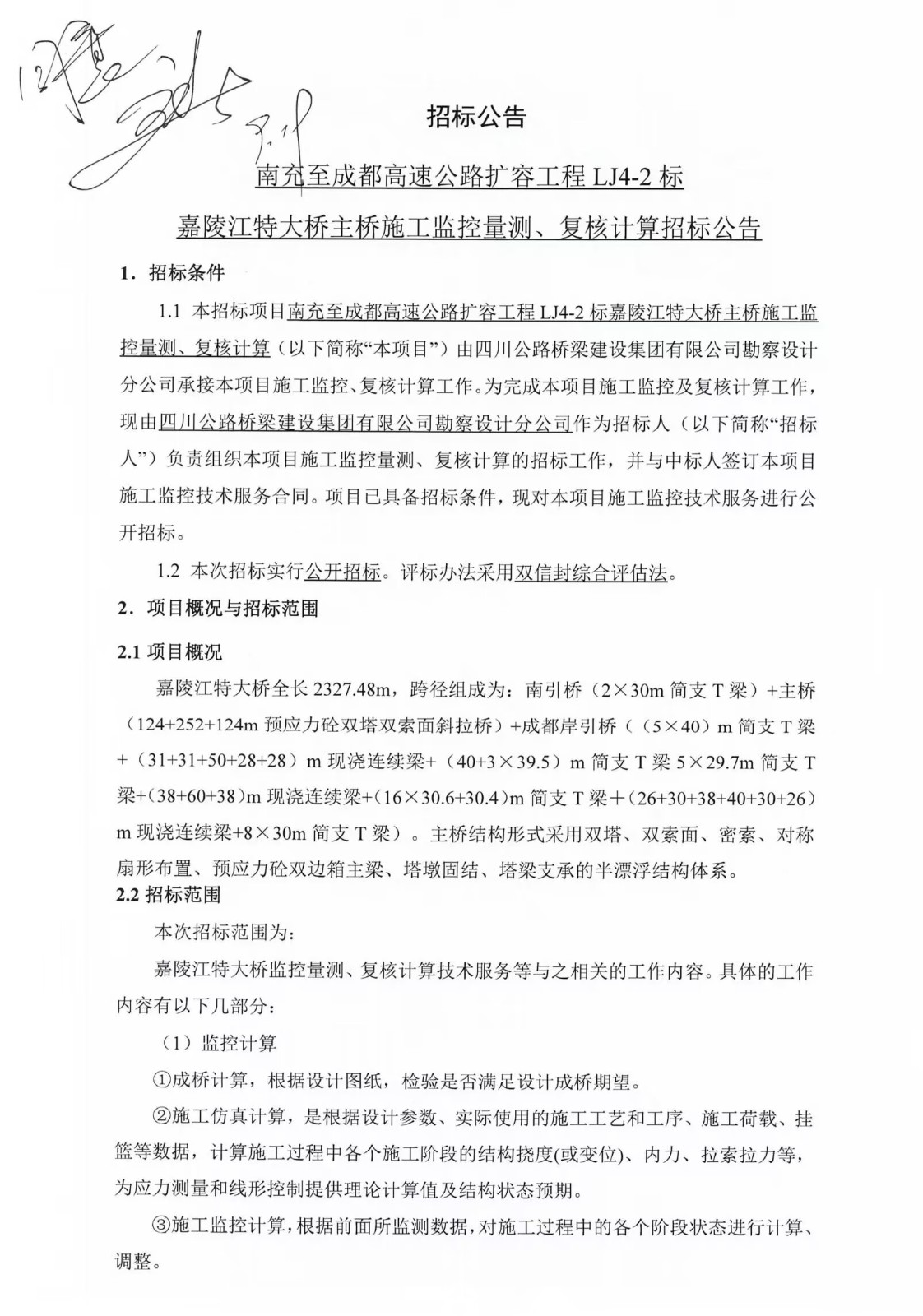南充至成都高速公路擴(kuò)容工程LJ4-2標(biāo)嘉陵江特大橋主橋施工監(jiān)控量測、復(fù)核計(jì)算招標(biāo)公告