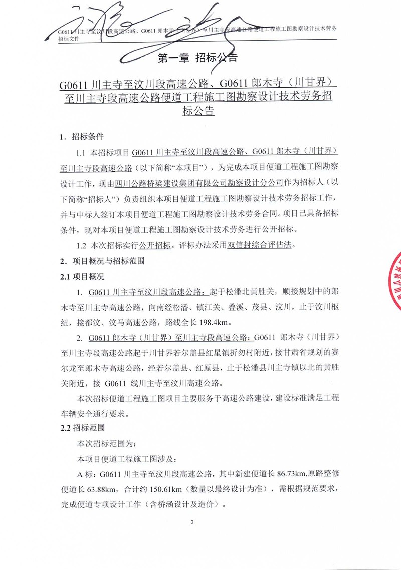 招標公告-G0611川主寺至汶川段高速公路、G0611郎木寺(川甘界)至川主寺段高速公路便道工程施工圖勘察設計技術勞務招標