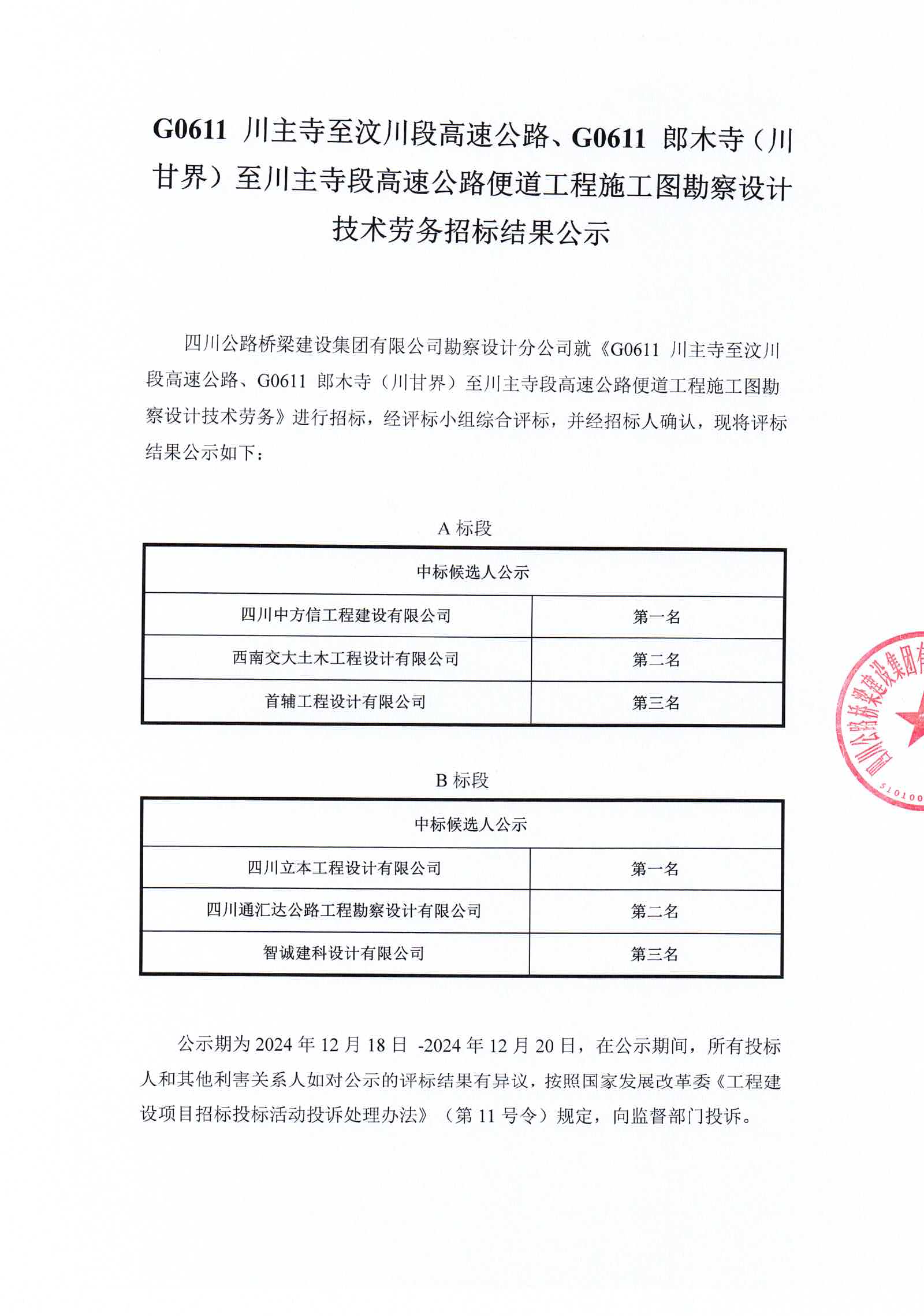 G611川主寺至汶川段高速公路、G0611郎木寺(川甘屆)至川主寺段高速公路便道工程施工圖勘察設(shè)計(jì)技術(shù)勞務(wù)招標(biāo)結(jié)果公示)