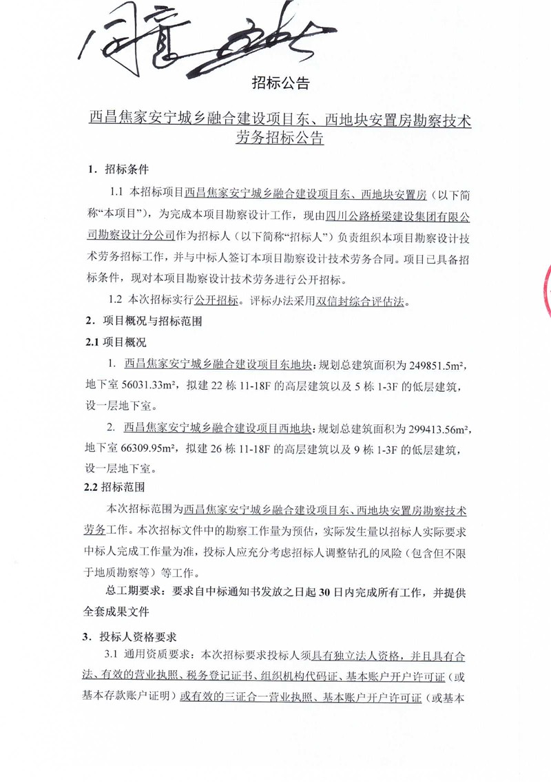 招標(biāo)公告-西昌焦家安寧城鄉(xiāng)融合建設(shè)項(xiàng)目東、西地塊安置房勘察技術(shù)勞務(wù)